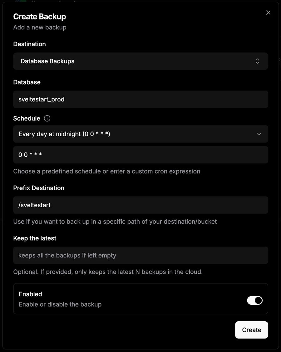 Now we need to set this as the destination for our database backups. Go to the project for your database and then to the 'Backups' tab. Click 'Create Backup', and set the destination to the bucket that you just added to Dokploy. Make sure you specify your app name in the 'Prefix Destination' field so that your database backups will be organised into folders by app name. As a result, you can use this bucket for all your apps. You can also specify the schedule for how often to backup.