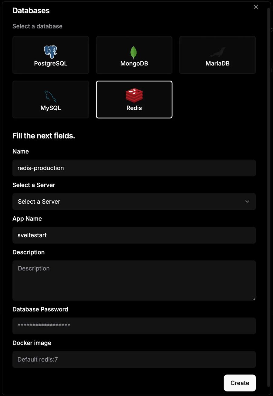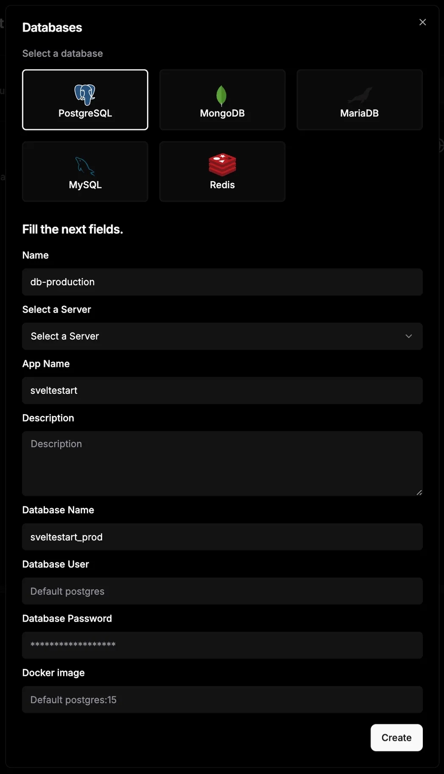 Deploying a database with Dokploy is very easy. Go to your project page and click 'Create Service', then click 'Database'. Then fill in the form as follows (replacing 'sveltestart' with the name of your app):