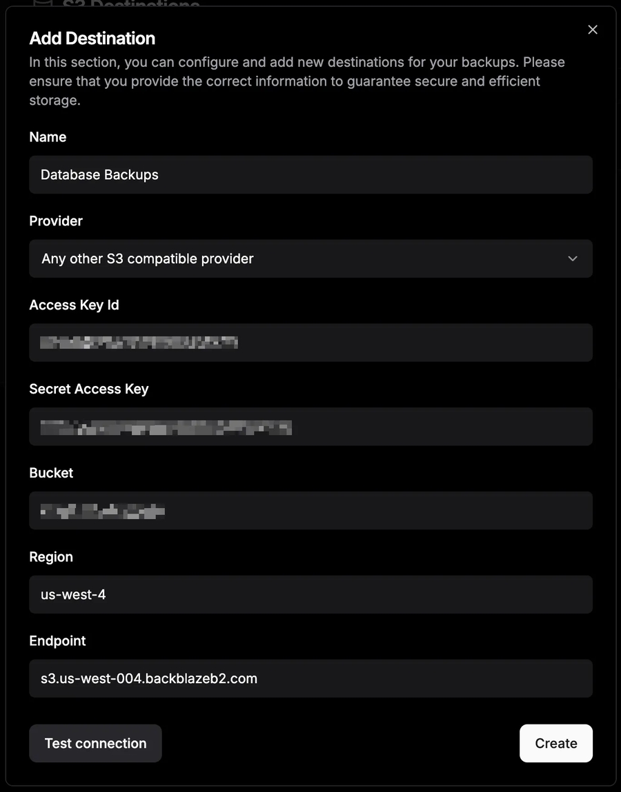 Once you have created an account with your cloud storage provider, create a new bucket with a unique name e.g. 'unique-name-db-backups'. You can use this bucket for all your apps. Create a key for this bucket with read and write access. Then go to the 'S3 Destinations' page in Dokploy and add the bucket as a destination.