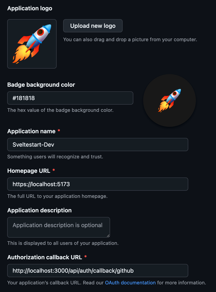 To set up Github login, go to Github developer settings and add a new OAuth app. Fill in the fields as follows, uploading your app icon as well: