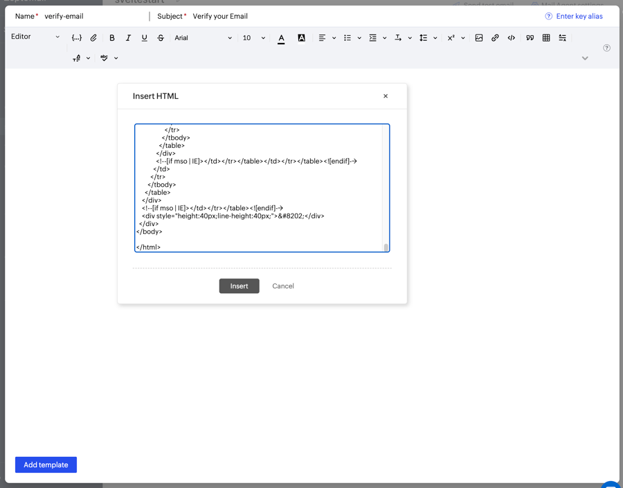 Let's first start with the verify.mjml template. Update the src attribute in the mj-image tag to your app's logo URL. Then convert the MJML to HTML via the MJML online editor. Navigate back to your mail agent in ZeptoMail and go to the 'Templates' tab. Add a new blank template and fill in the name and subject fields. Then click on the code icon button to insert HTML. Copy and paste the HTML from the MJML editor into the code field.